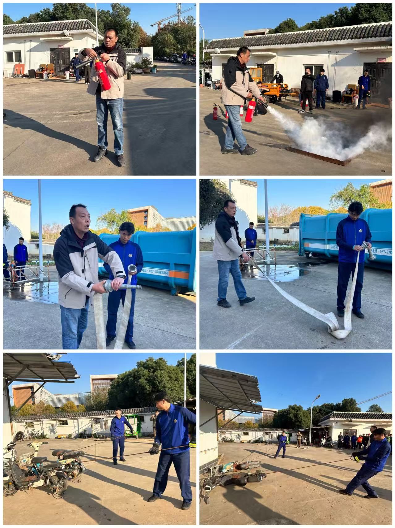 随后,全体员工分组进行实操演练。在教官的指导下,参训人员沉着冷静,正确使用灭火器对准火源根部喷射,成功扑灭火焰;两人一组迅速展开水带、精准对接接口、快速铺设线路,动作规范有序;利用勾具精准勾拉“起火”电动车,将其与周边停放车辆分离,开辟安全隔离带。