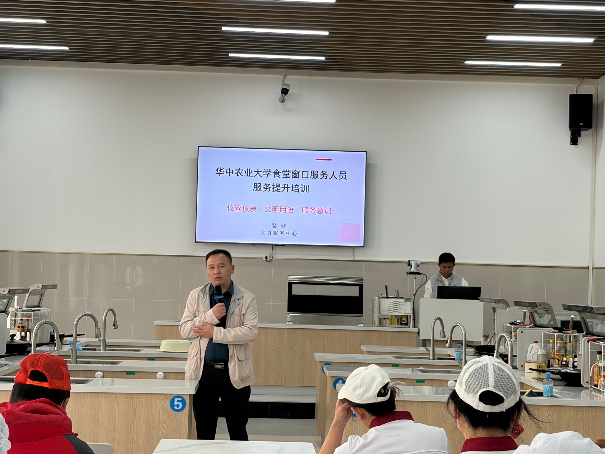 培训伊始,中心副主任罗云华首先向全体参训人员简要介绍当前食堂服务工作面临的新形势、新要求,明确了提升窗口服务质量对于保障就餐人员权益、优化食堂整体服务形象的重要意义,强调全体服务人员要高度重视此次培训,认真学习、切实掌握服务标准,将规范要求融入日常工作每一个环节。随后,介绍中心副主任裴健担任本次培训主讲人,为全体人员开展专业、系统的服务培训。